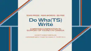 Do Wha(TS) Write is an annual short fiction competition with a word limit of 1000 words, and unlimited entries at $5 each. All proceeds from this contest go directly towards Tourette Canada, the Canadian national charity that supports people living with Tourette Syndrome and their families.